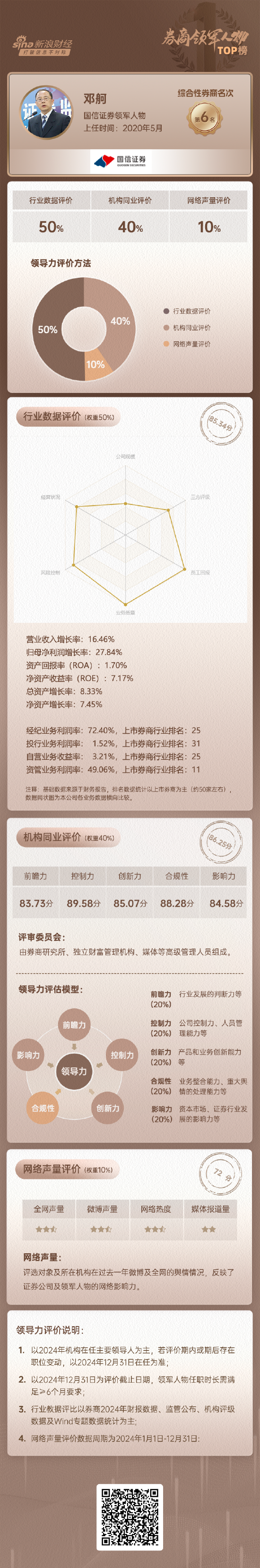 综合性券商TOP榜:国信证券邓舸第六 网络声量得分仅70分